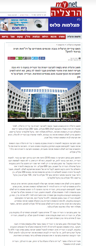 כתבה שפורסמה במקומון הרצליה בגין תביעה מנהלית ייצוגית כנגד עירית הרצליה.