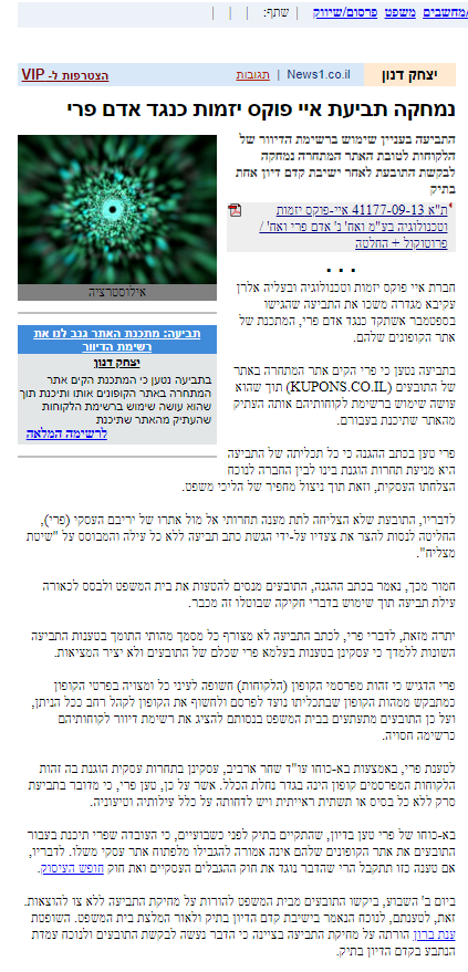 כתבה שפורסמה בעניין תיק הגנה שניהל משרדנו בתביעת זכות יוצרים בסך של 200,000 ש"ח שהסתיימה במחיקת התביעה וזאת לאחר דיון בקדם משפט.