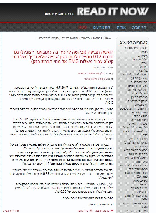כתבה שפורסמה ברשת באתר read it now בדבר תביעה ייצוגית שהגיש משרדנו כנגד 012 סמייל טלקום בגין גבייה שלא כדין.